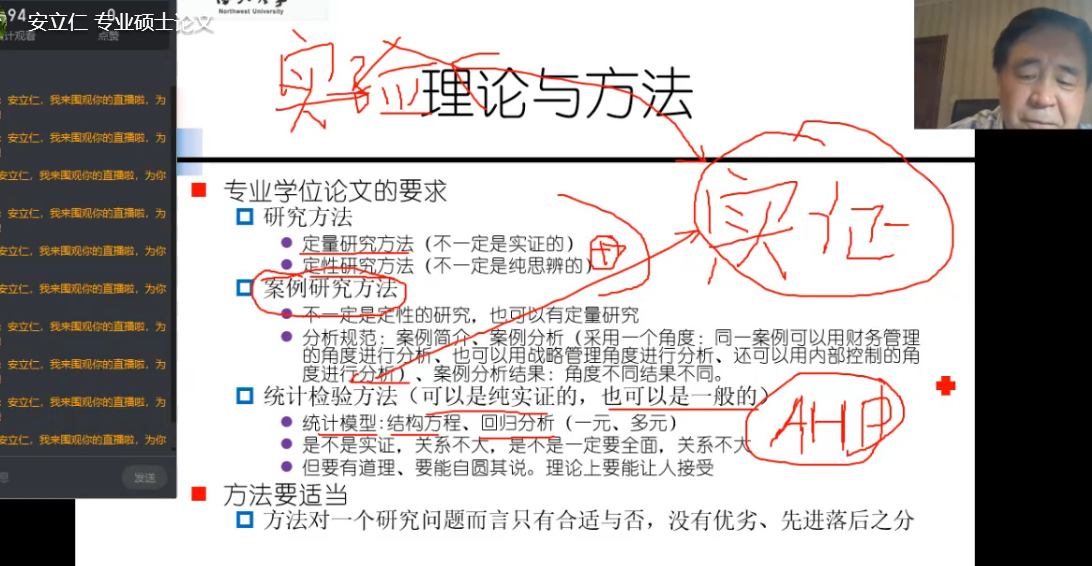 关于理论与方法,主讲人提到对审计理论的综合运用一定要以审计理论为主,同时综合运用其他管理理论、经济理论作为支撑,审计从本质上讲,涉及委托代理理论、博弈理论、信息理论,要找到系统的理论支撑。论文的研究方法可以采用定量研究、案例研究、统计检验方法等,同时要注意研究方法的选用必须适当。