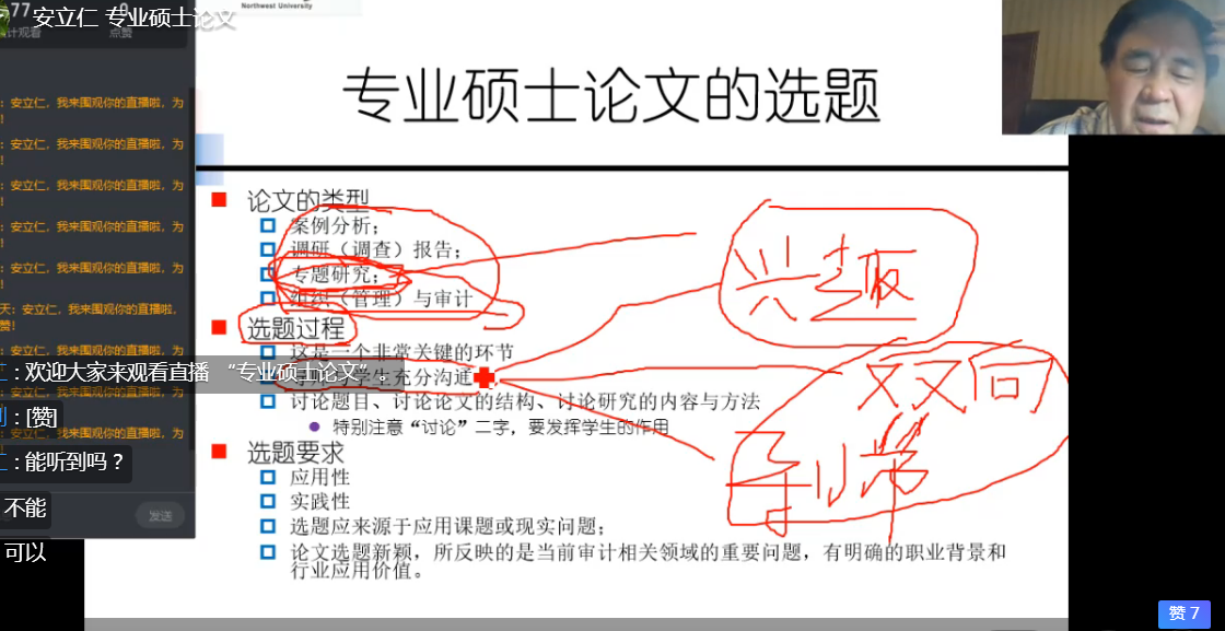 讲座中,主讲人结合本人长期从事研究生指导工作中的经验,围绕专业硕士论文的选题、理论与方法、结构、写作要求等展开论述。他指出,要结合审计专业硕士培养目标确定学位论文的选题,要侧重于应用型研究,从写作类型上分析,建议可以包括案例分析、调研报告、专题研究等类型。他认为选题是一个非常关键的环节,建议研究生们要和各自的导师进行充分讨论和沟通,对文章题目、结构、研究内容与方法等要充分论证,听取多方意见和建议,并强调选题一定要具有应用性、实践性等特征。