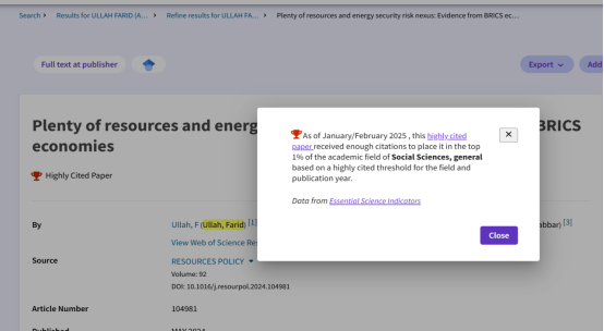 经查证显示,截至2025年1月/2月,西京学院会计学院Farid Ullah博士发表的一篇学术论文被选为“Social Sciences”学术领域基础科学指标(ESI)中被引用率最高的1%论文。论文标题为“Plenty of resources and energy security risk nexus: Evidence from BRICS economies”,发表在《Resources Policy》杂志,该杂志是JCR一区SSCI期刊。