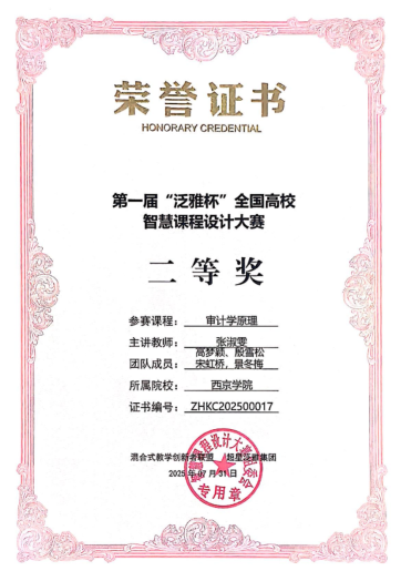7月30—31日,第一届“泛雅杯”全国高校智慧课程设计大赛在超星尔雅科技园举行,由西京学院会计学院张淑雯教师带领的《审计学原理》课程团队作为本次我校唯一入选的队伍荣获全国二等奖,该成绩是我院在该项赛事中的最好成绩。