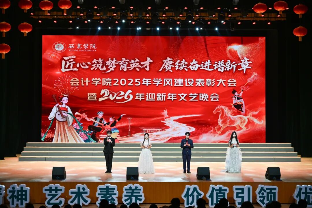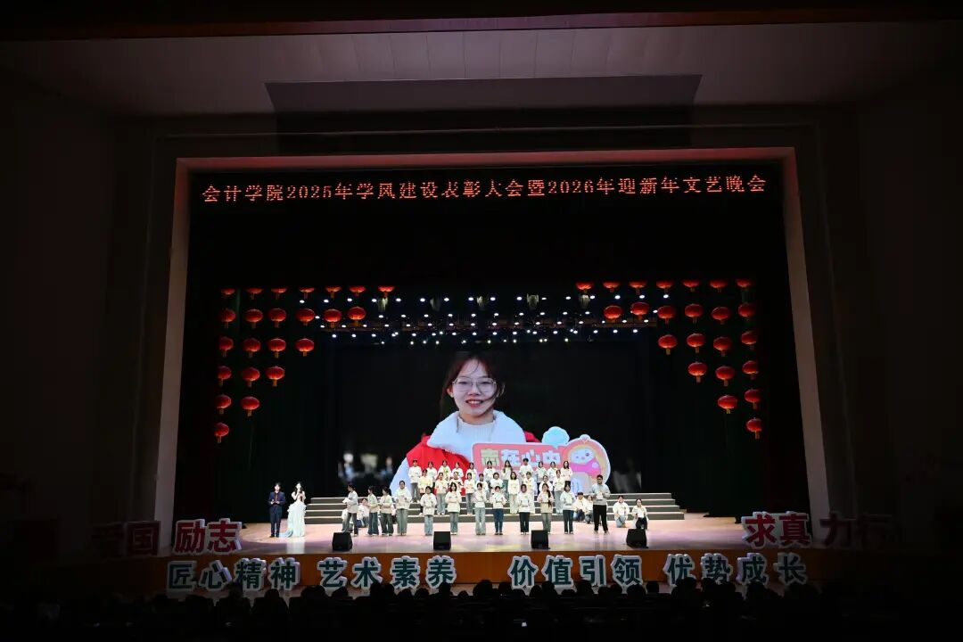 时序更迭,新程启幕。12月22日19:00,会计学院2025年学风建设表彰大会暨2026年迎新年文艺晚会在京华礼堂圆满举行。副校长王正斌、体育与美育教育中心、马克思主义学院、行健书院相关领导出席,各系教师、班主任、辅导员与全体学生欢聚一堂,回溯2025年的耕耘足迹,共赴2026年的璀璨新程。