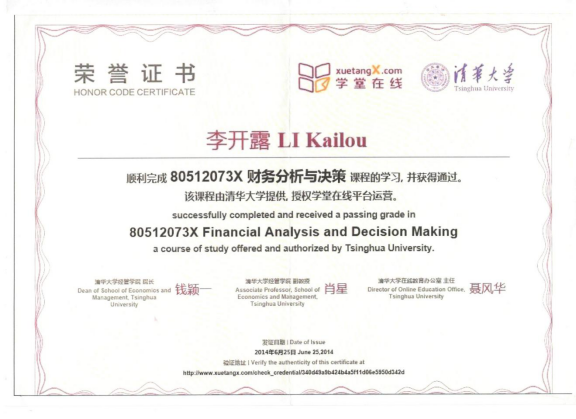会计学院一贯坚持利用多种学习资源,促进学生全面发展。大一的李开露因为参加商业案例大赛,在老师的指导下,自学清华大学“学堂在线”慕课课程,并获得《财务分析与决策》《心理学概论》等证书。通过坚持自己的学习计划,大一期末测试中,她取得了优异成绩,获得西京学院“优秀学生一等奖”,同时还获得国家励志奖学金。在大学生数学竞赛中收获一等奖。