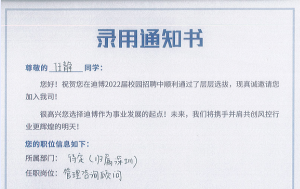 2021年11月13日,深圳市迪博企业风险管理技术有限公司(以下简称“迪博”)秋季校园招聘在西安举行。因新冠肺炎疫情影响,秋招竞争比想象的更加激烈。不负期待与努力,最终有幸收到迪博的面试邀请,并顺利通过面试收到offer。