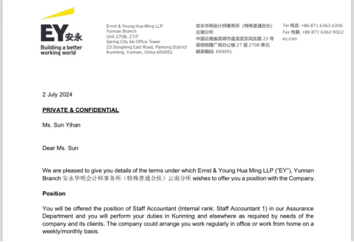 孙艺菡,西京学院会计学院CPA2002班学生,目前已收到国际四大会计师之一的安永华明会计师事务所(特殊普通合伙)云南分所的录用Offer。