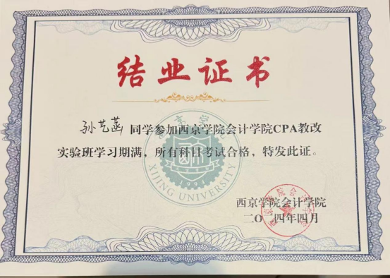 大学四年里,在会计学院CPA教改实验班各位老师的悉心指导下,孙艺菡同学认真学习专业课程,成绩优异,打下了扎实的专业基础,并在大学期间考取了初级会计资格证书等,参加了金融挑战赛等,有丰富实习经历。