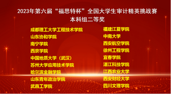 近日,2023年第六届“福思特杯”全国大学生审计精英挑战赛落下帷幕,经过激烈比拼,代表我校参赛的会计学院CPA教改实验班吴仪竹青、孙佳仪,审计学专业尚林屹等同学组成的代表队喜获全国总决赛二等奖。