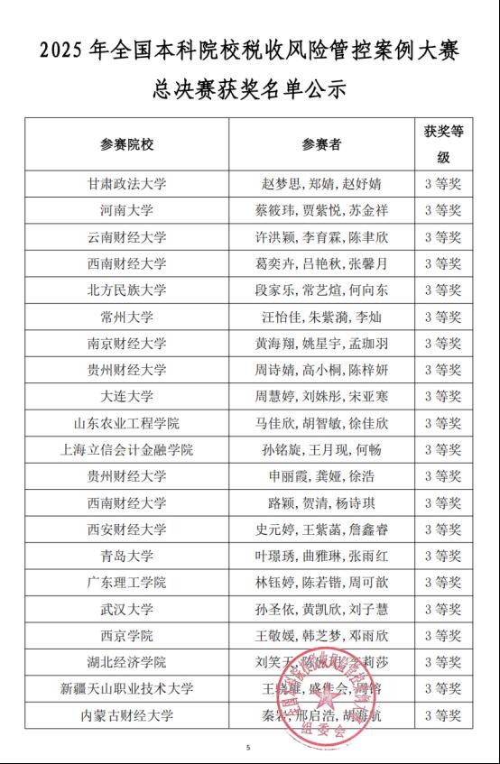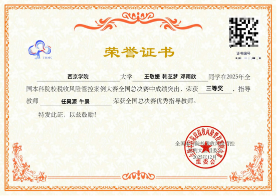 2025年12月,获全国本科院校税收风险管控案例大赛全国三等奖