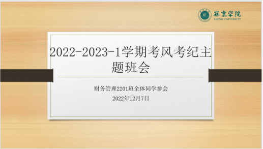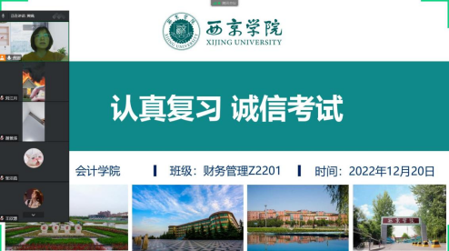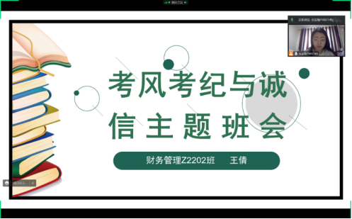 6.财务管理专升本2202班班主任王倩,于12月20日,组织学生线上参与“考风考纪与诚信专题教育班会”。号召同学们树立诚信,杜绝作弊,从而形成良好的考试环境。为同学们解答和同学们讨论线上考试需要注意的一些问题,确保考试顺利进行。