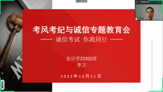 8.会计学专升本2202班班主任李卫,于12月21日,同辅导员孟洁一起召开了班级考风考纪与诚信专题教育班会。会上强调,期末考试周临近,但疫情防控仍然不能松懈,当前既要做好最后一周的线上听课,又要做好作业提交、考前复习等工作,而诚信教育和诚信考试又贯穿于这一整个过程,并同每一位学生的学分获得、证书获取等密切关联,要求所有同学务必积极做好考前准备,以积极、自信的态度对待考试,树立诚信标杆。