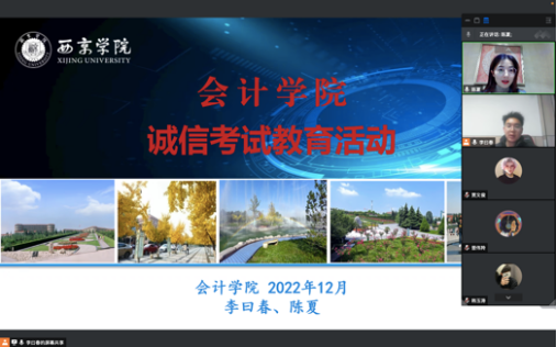 3.会计学B2105班班主任陈夏,于12月16日,协助辅导员李曰春开展考风考纪与诚信专题教育班会。会上,班主任陈夏针对考场纪律、考试环境等进行强调,特别针对由于网络原因可能影响的线上试卷提交情形进行了说明,鼓励学生做好十足准备,端正考风考纪。