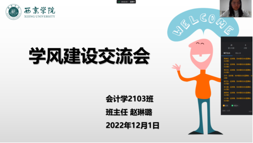 1.会计学2103班班主任赵琳璐,于12月1日,召开学风建设交流会,在近期补课较多的形势下,问询学生学业上的困难,并予以解答,调整好学生心态,督促学生上课认真听讲;于12月18日,召开线上师生交流会,在学生已大部分返家的形势下,问询学生学业学习情况、期末复习情况、学业是否存在困难等,督促学生认真听讲,认真对待期末考试。