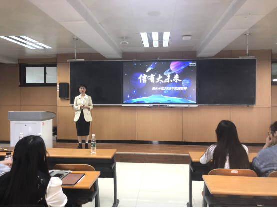 随后,周燕妮就集团的福利待遇、工作环境、岗位需求及未来职业发展等学生关心的问题进行了详尽的说明,为学生们提供了宝贵的第一手资料,同时,会计学院会计学专业2024届毕业生代表,就前期在信永中和共享中心工作期间的实习经历和心得体会进行了分享,为即将步入实习岗位的学弟学妹们提供了宝贵的建议和参考。