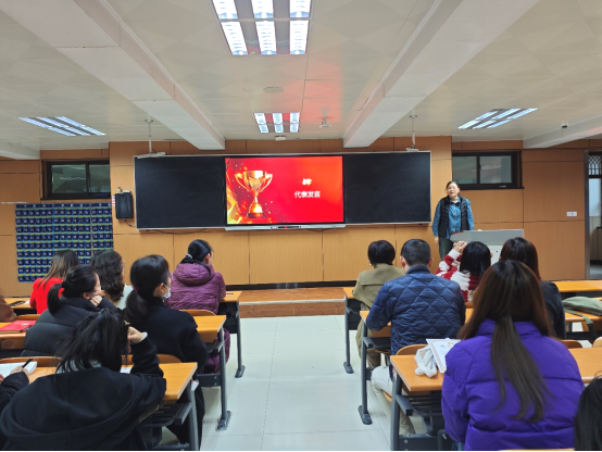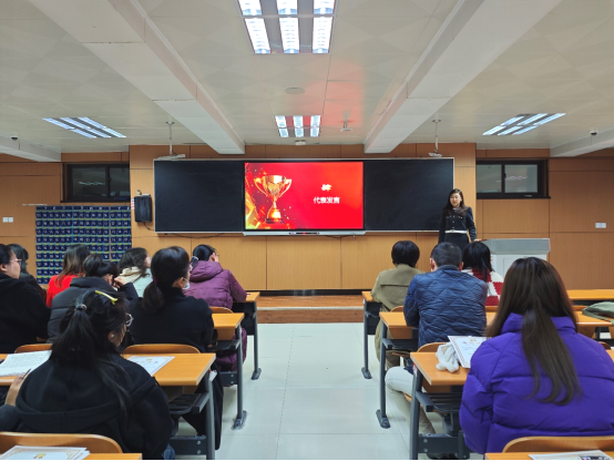 朱平平、陈逢怡一分别对本学期的英语四级专项训练开展情况进行了介绍,并就本次竞赛做了总结,全面分析了学生的竞赛成绩,展示了学生在英语学习上的进步和成效,也剖析了大家目前在英语学习方面存在不足的原因,并为接下来进一步的辅导活动提出了改进措施。