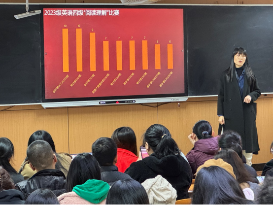 最后,院长李海霞对本学期英语“听力”“阅读理解”专项训练和竞赛的组织给予了充分认可,对全体班主任、辅导员的付出表示感谢,对同学们取得的成绩表示肯定。她号召大家在英语学习方面继续努力,争取更大的进步,同时也鼓励学生多参加类似的竞赛,迎接未来的更大挑战。本学期的专项训练,不仅提高了学生在听力和阅读理解方面的能力,通过比赛也增强了师生间的互动,还激发了大家对英语学习的兴趣,为后期的英语四级考试奠定了基础。