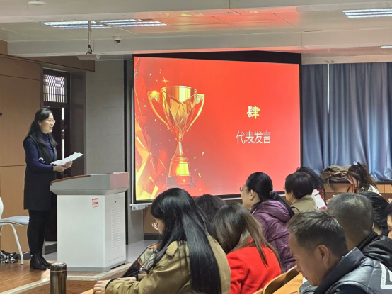 学生科科长陈垚希回顾了本学期开展的英语“听力”和“阅读理解”专项训练工作。她表示,学院高度重视学生在校期间的英语四级通过情况,强化英语四级备考是近年来学院针对低年级学生非常重要的工作。本学期在班主任和辅导员的大力配合下,通过开展英语“听力”和“阅读理解”日常训练、阶段性测验和期末竞赛等活动,学生学习英语的热情得到充分调动,积极性比以前有明显提高。