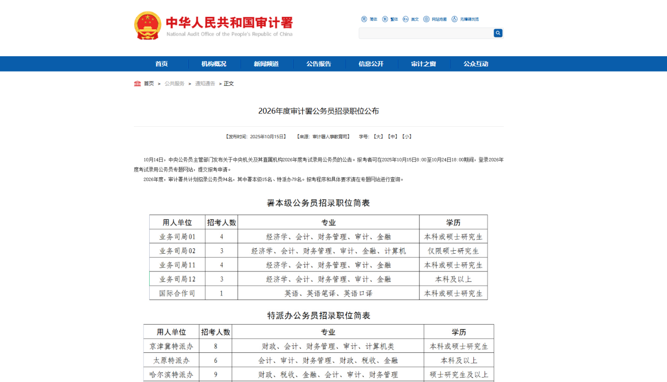 2026年度,审计署共计划招录公务员94名,其中署本级15名、特派办79名。报考程序和具体要求请在专题网站进行查询。