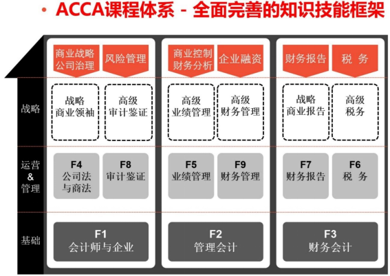 ACCA的课程是根据现代社会对财会人员的实际要求进行开发、设计的,特别注意培养学员的分析能力和在复杂条件下的决策、判断能力。课程按照难度由浅入深分为应用知识阶段、应用技能阶段和战略专业阶段三个模块,涵盖财务分析、企业融资、税务、风险管理、公司治理等多个行业方向,全方位打造全面完善的知识技能架构。