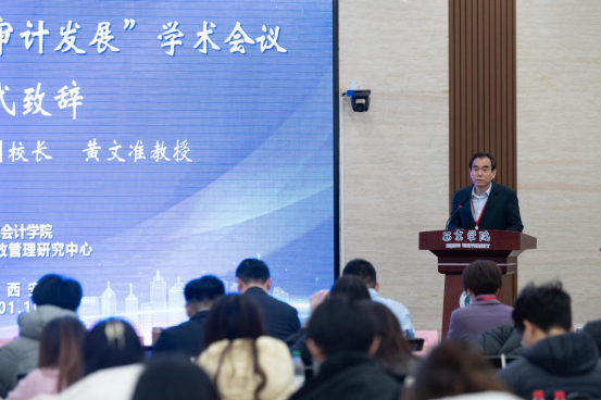西京学院副校长黄文准教授代表学校致辞,并向浙江大学董望教授、新加坡管理大学Holly Yang教授、美国康奈尔大学P. Eric Yeung教授等海内外专家表示热烈欢迎。黄文准指出,当前以人工智能、大数据为代表的新一轮科技革命对各学科带来前所未有的冲击,会计、审计作为经济管理基础学科,也在经历着深刻的变革,面临理论框架、教育范式、职业伦理等的重构。他还为嘉宾介绍了西京学院发展历程、办学理念、培养特色以及会计审计学科在专业建设、学术科研等方面取得的显著成绩。
