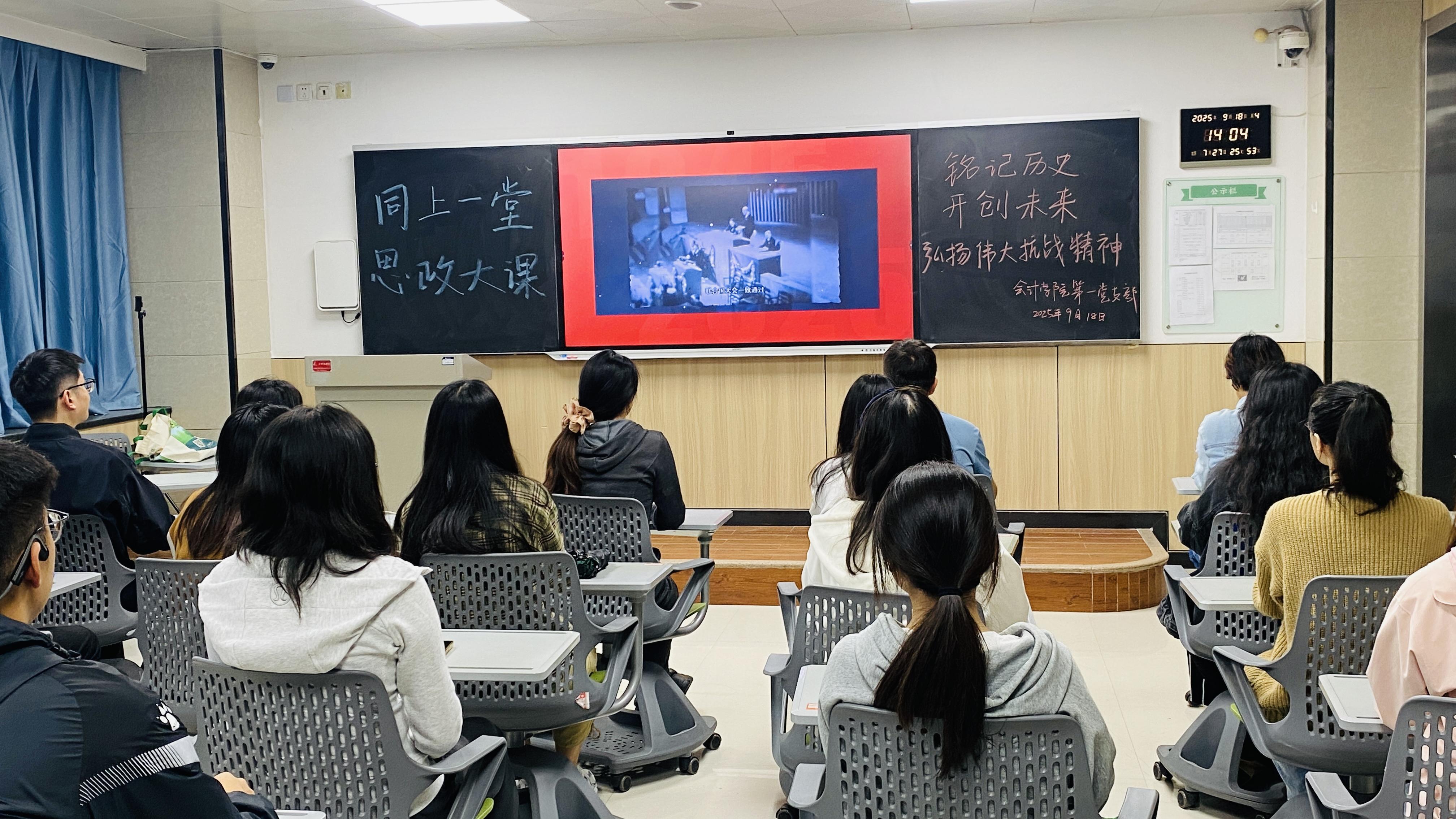 9月18日,在“九一八”事变纪念日这一特殊节点,会计学院党委统筹部署,组织全院五个党支部联动开展“同上一堂思想大课”活动,纪念中国人民抗日战争胜利暨世界反法西斯战争胜利80周年。活动通过“集中观看+讨论发言”的形式,引导党员筑牢思想根基、厚植家国情怀,以思想共识凝聚行动合力。